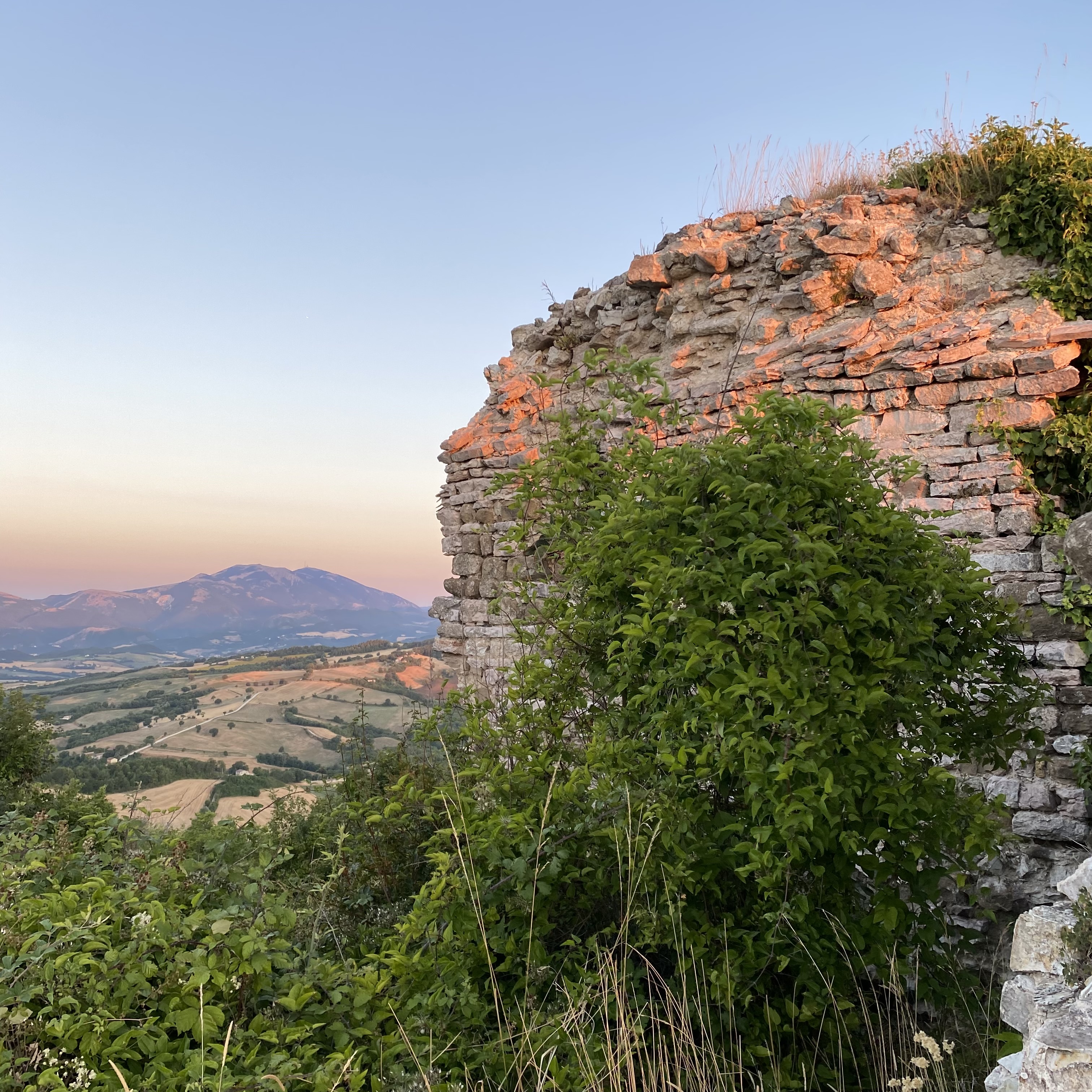 ….from which you get a fine view of Monte Catria……. lit up by the early morning sun…..(6am!)