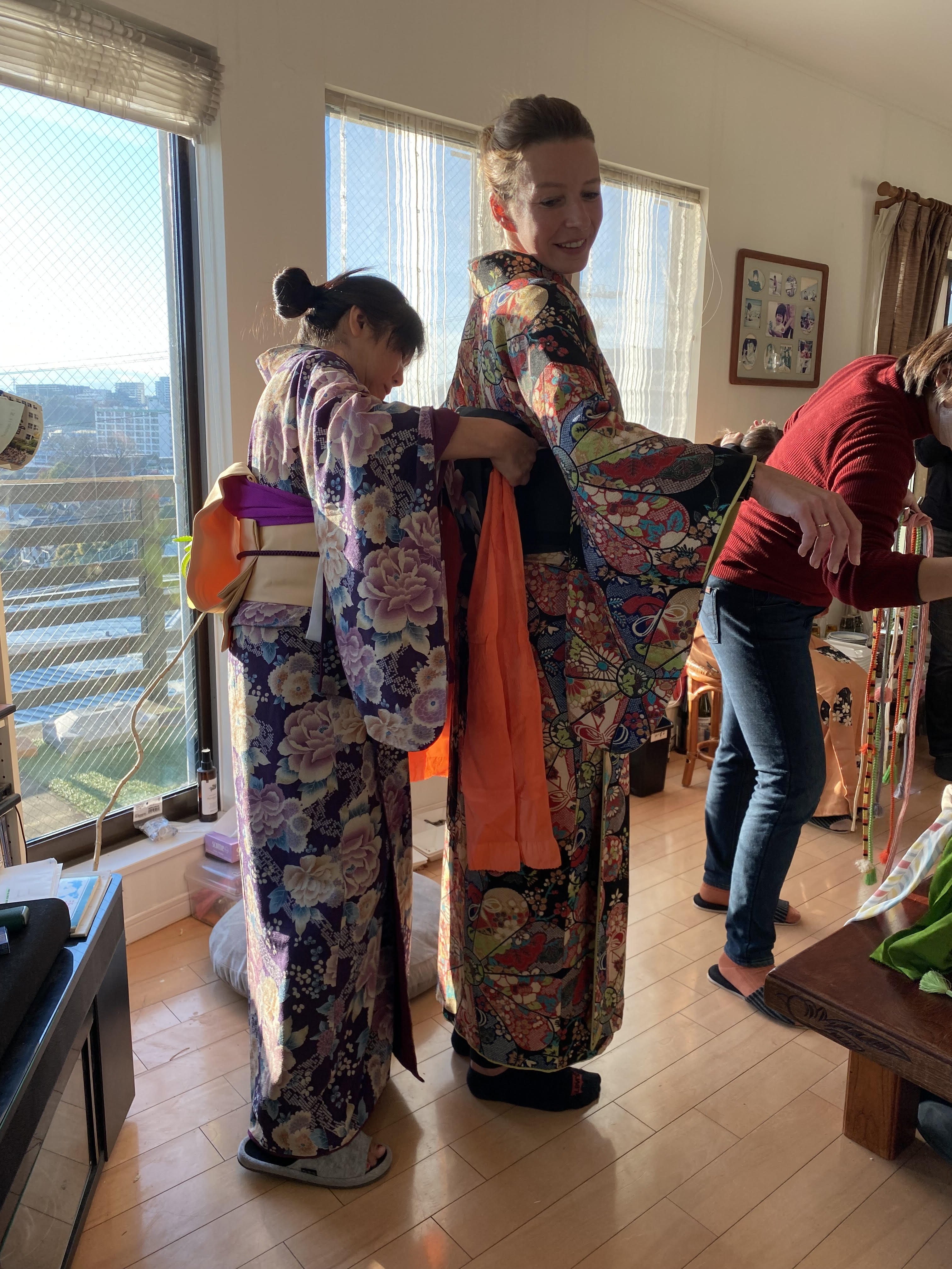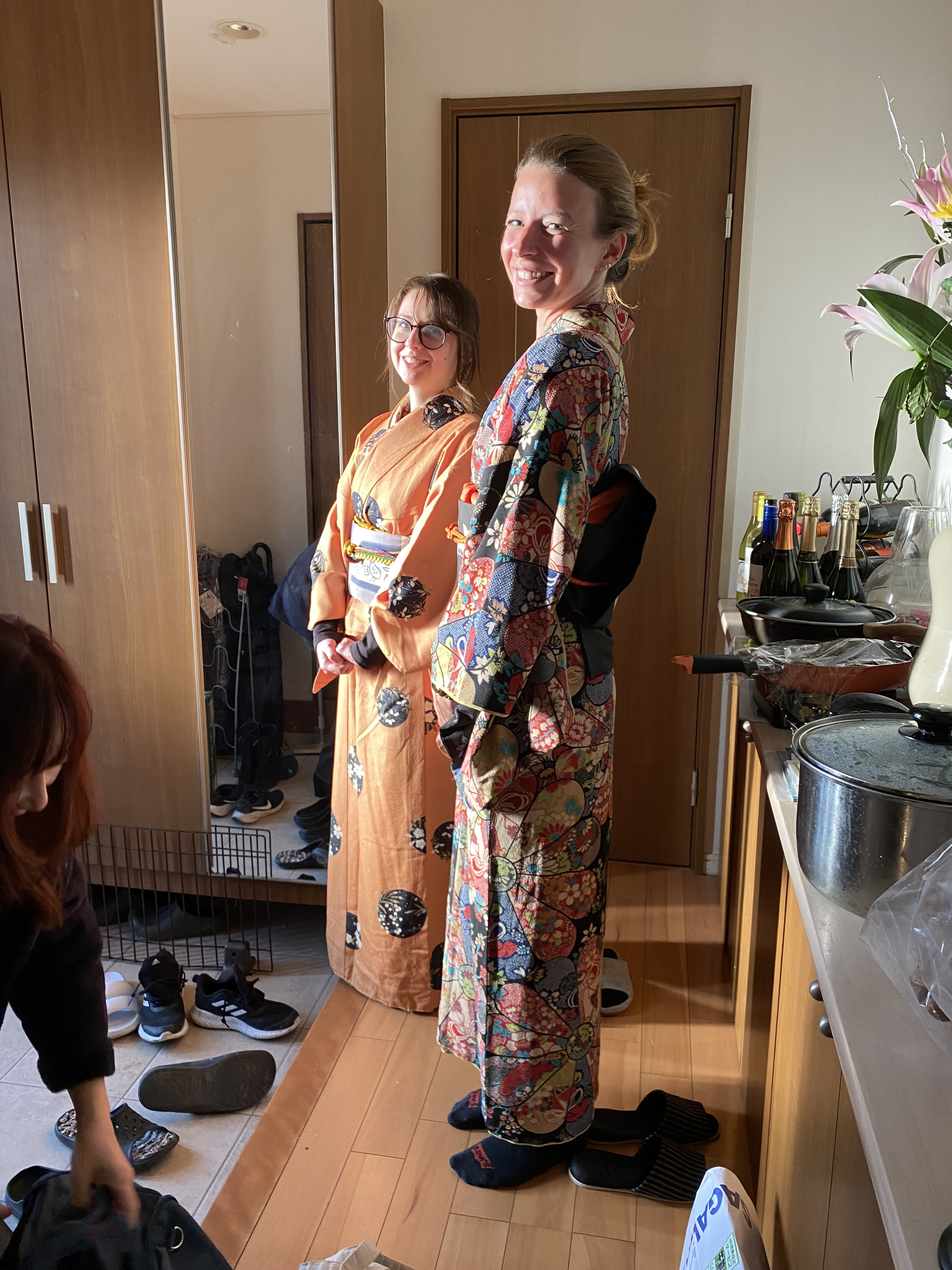 ๐ถ And back home in Hoshikawa you can’t have a tea ceremony without kimonos. So Misako-san and Sayuri-san gave some expert instruction to our two guests from Germany…