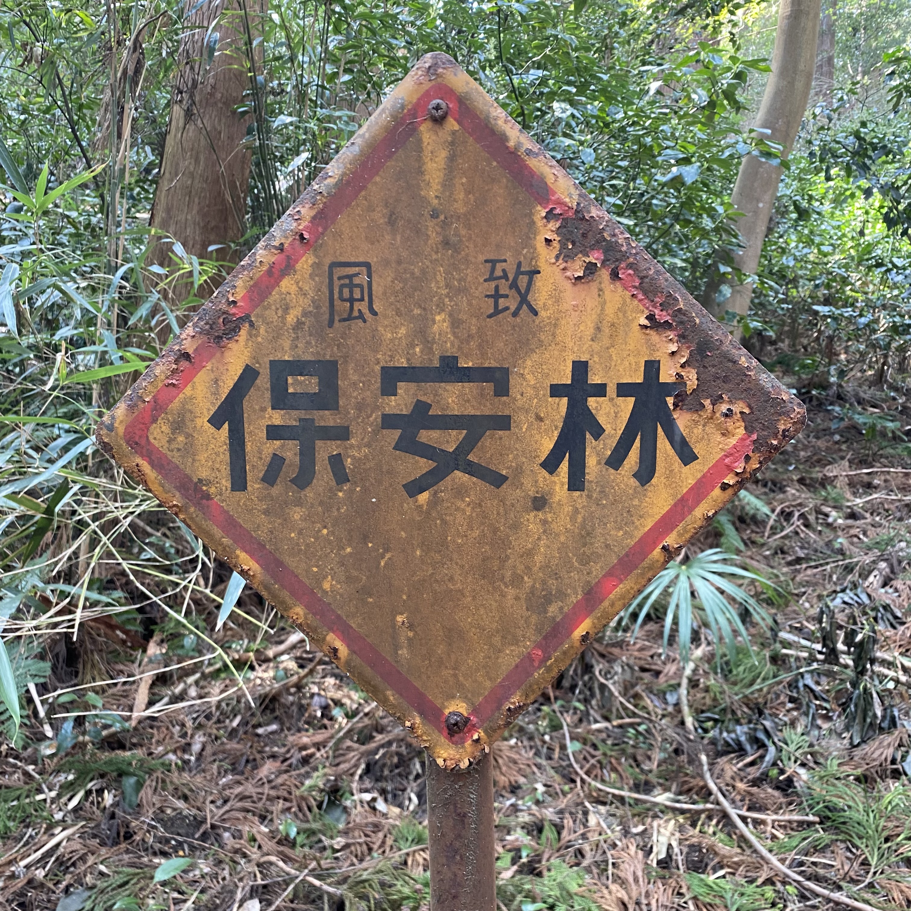 ๐ Or I am walking in the forest and see this sign – it is so old. Is it a warning of some sort? I start decifering the Kanji: Security Forest?…..Protected Forest maybe? What about Forest Reserve. That sounds more plausible.