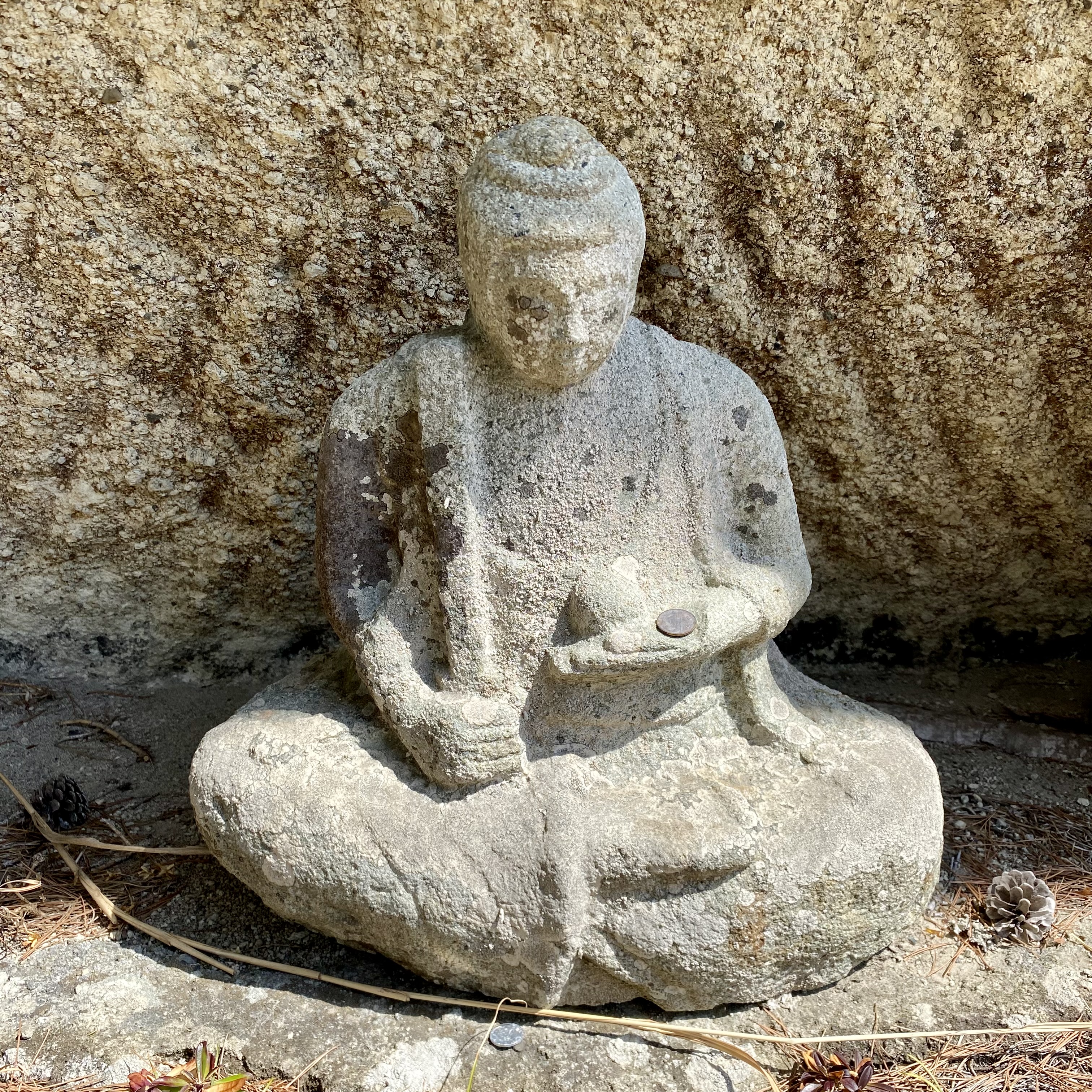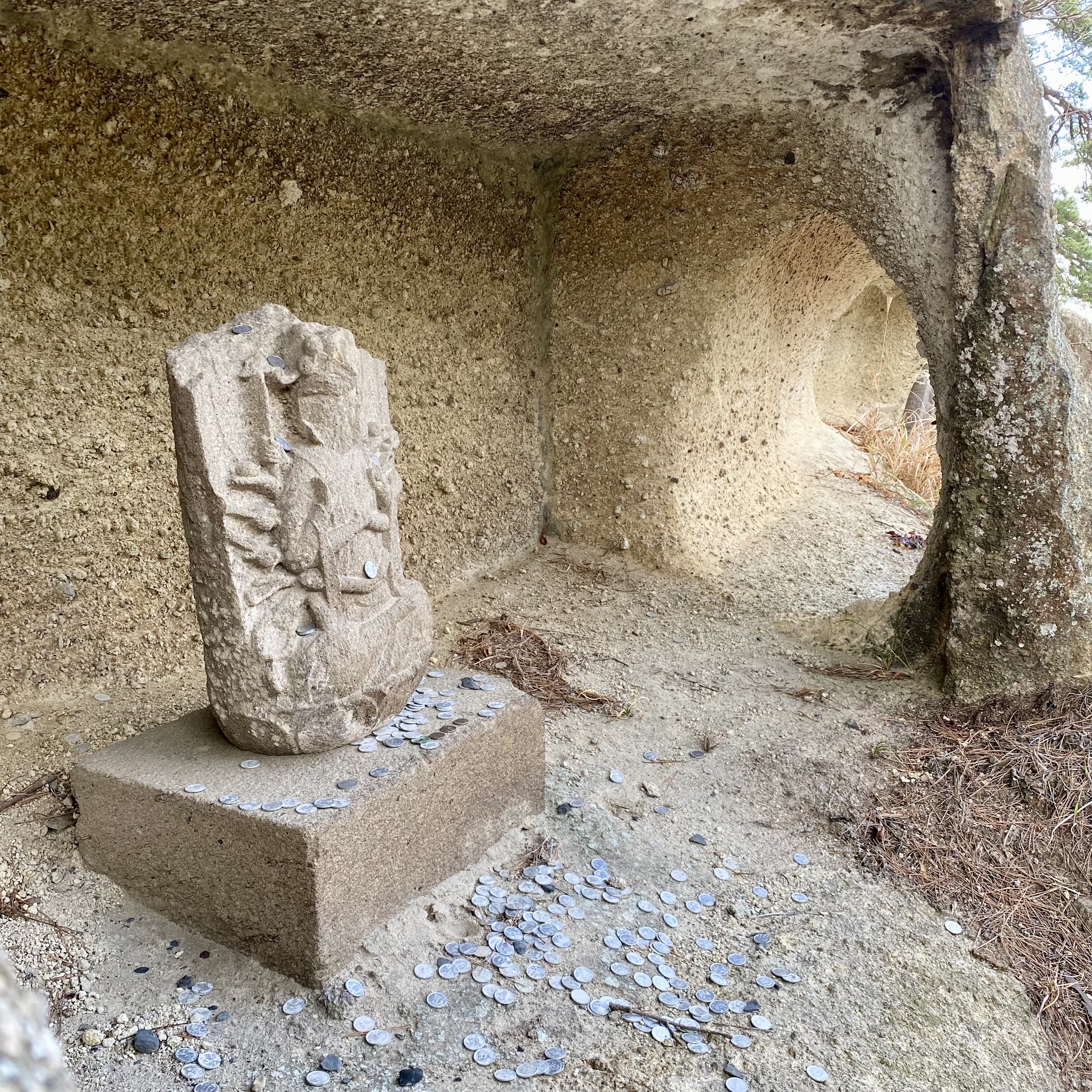 Many statues have been eroded by the elements, but still receive offerings…….(I have often wondered what the point of those 1 yen coins are, now I know)